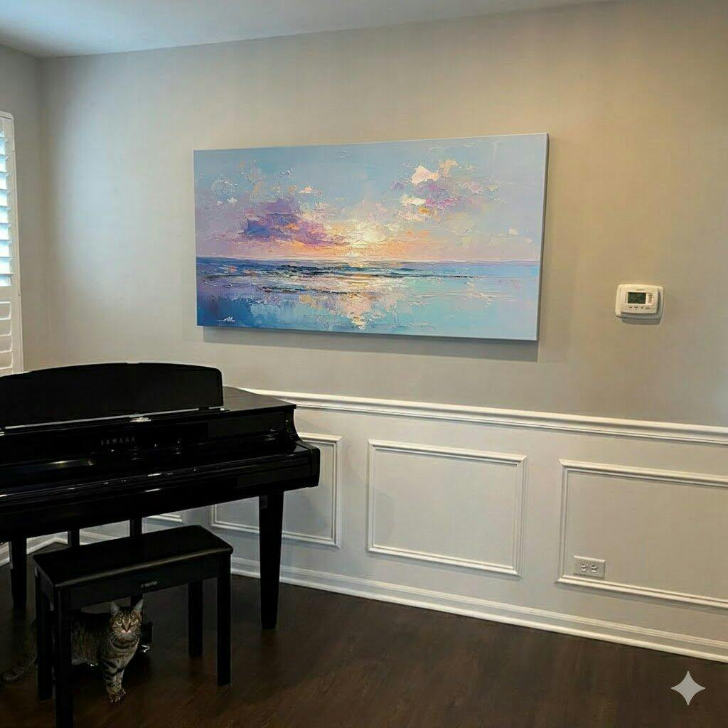 Drawn to the mysterious beauty of purple - hued sunsets over the ocean, the artist experimented with different shades of purple and blue. They built up the layers to create a sense of depth and mystery, capturing the essence of an evening by the sea. This painting is ideal for a dimly - lit cocktail lounge, adding a touch of mystery and elegance to the space. It also works in a bohemian - styled bedroom, enhancing the free - spirited and artistic ambiance.Handmade Acrylic/oil painting on canvas, Unframed/Not stretched. Packing: Rolled and shipped in a solid tube. The painting come with EXTRA 2-3 inch white border around for stretching or framing. Delivery time: You will receive the painting around 7-12 days( 3-5 days to finish the painting, 5-7 days to your home.by Fedex And Dhl)